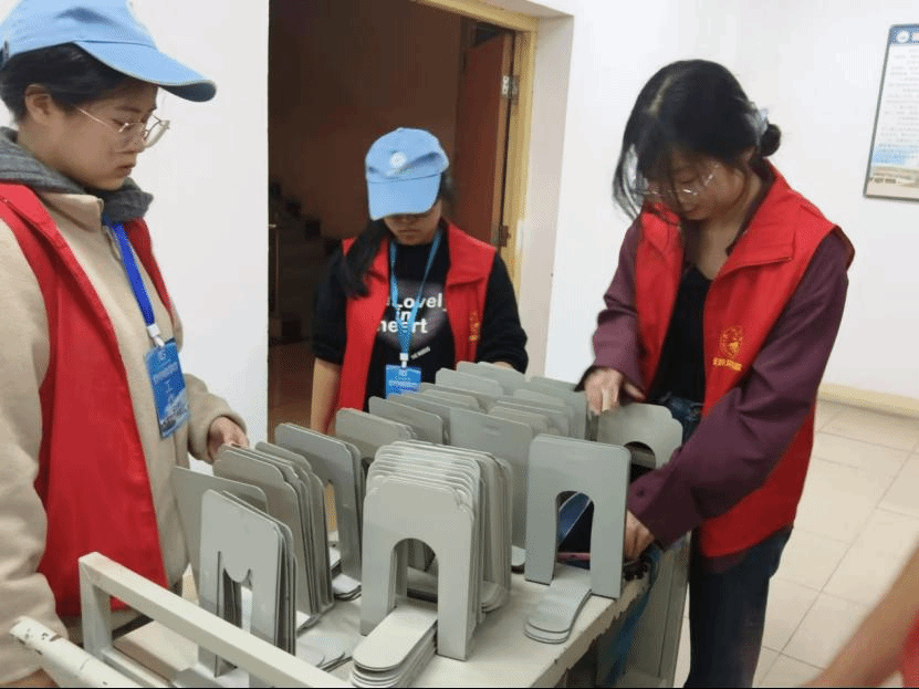 活动开始前,志愿者们到达图书馆门口集合,集合完毕后,由各小组组长分发志愿者服装,并带领组员前往指定楼层区域开展图书馆清洁工作,主要包括站岗、图书整理、书架清理等。