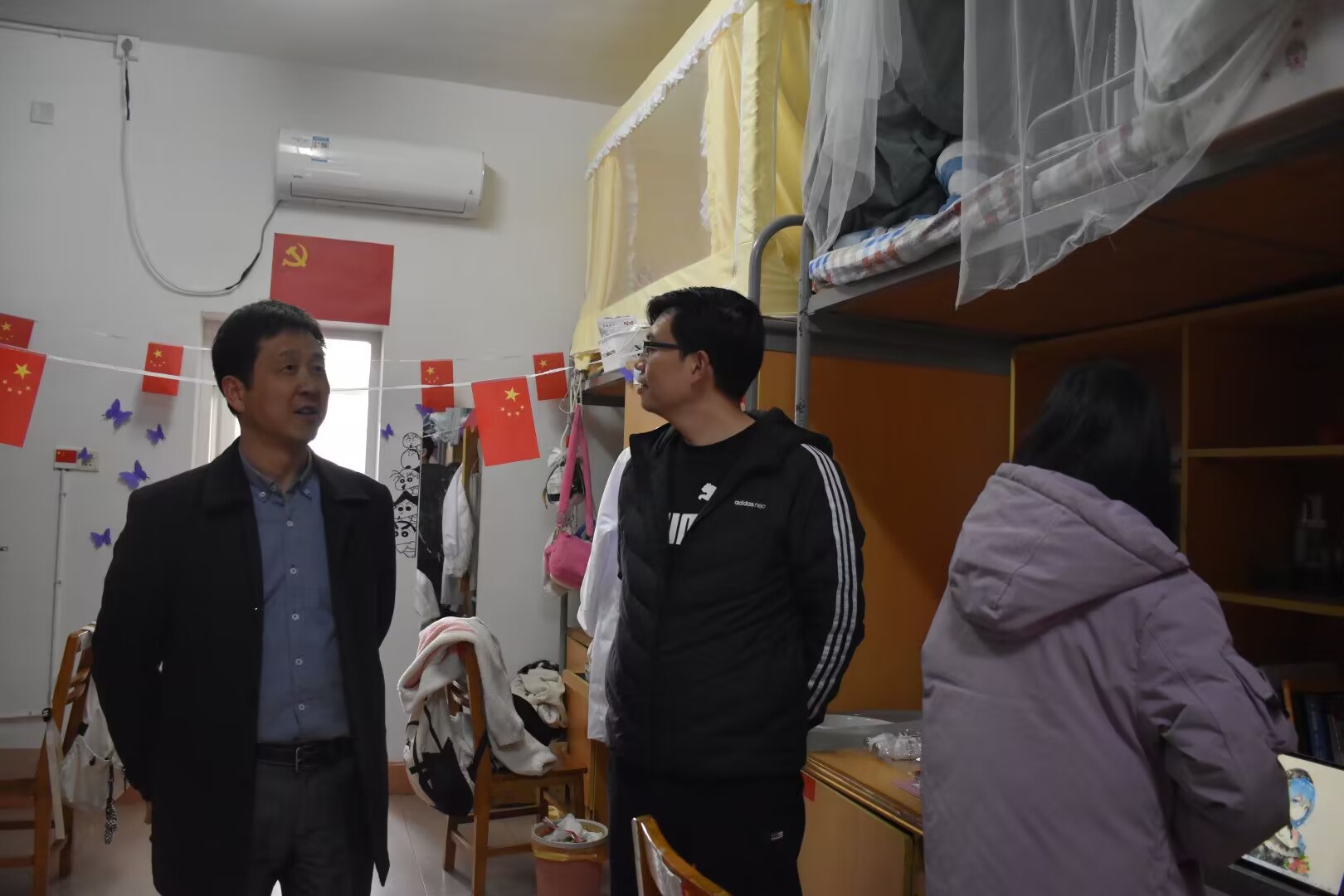 为进一步加强学生宿舍安全管理,深入了解学生思想、生活及学习情况,为新学期营造良好学习生活环境,3月1日下午,KY开元集团官网入口党委书记杨期勇,党委副书记张杨帆,学生管理科科长龚双双,学生教育思政科科长肖国光一行对KY官网学生宿舍进行走访排查。