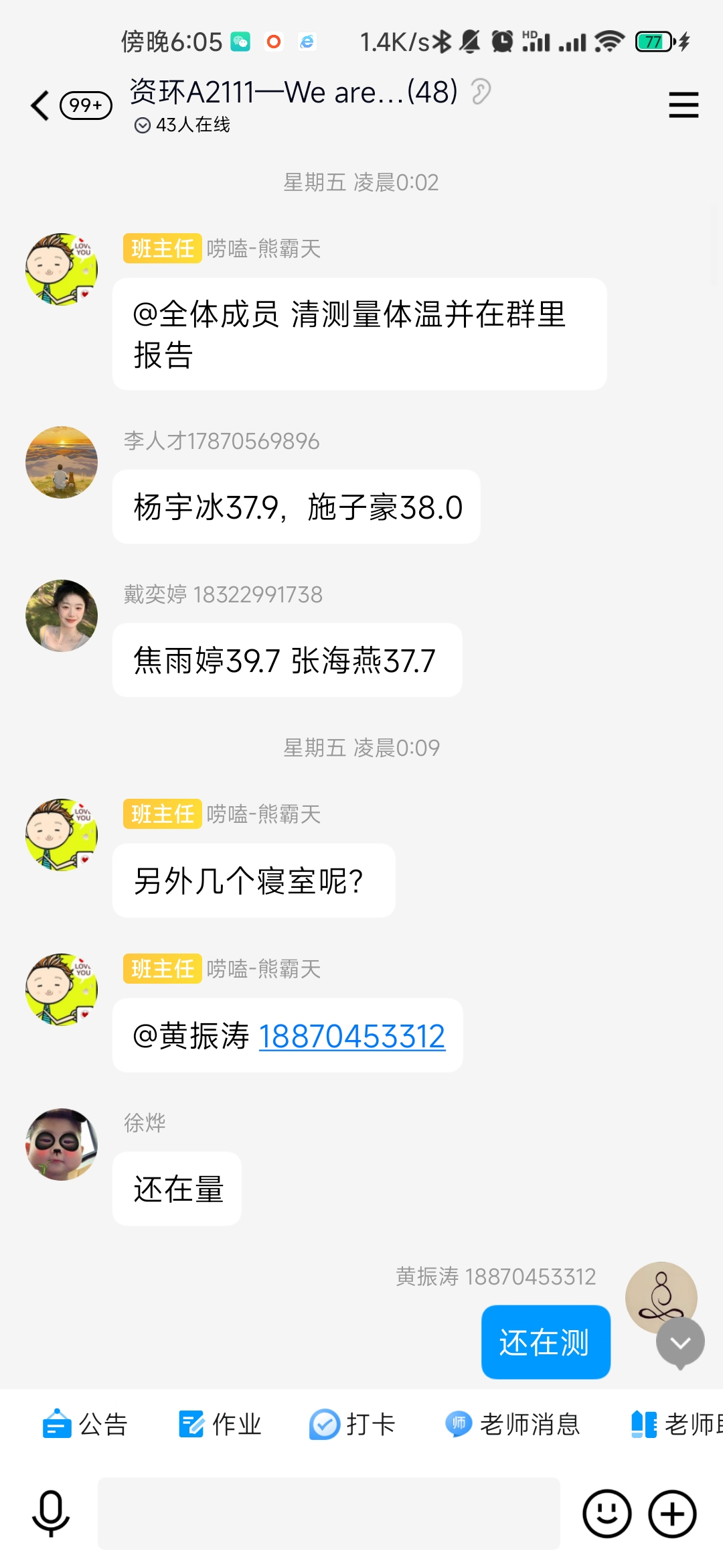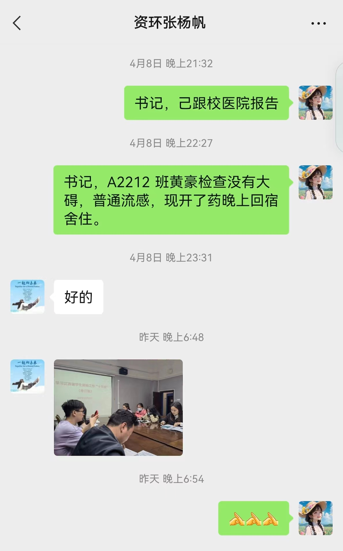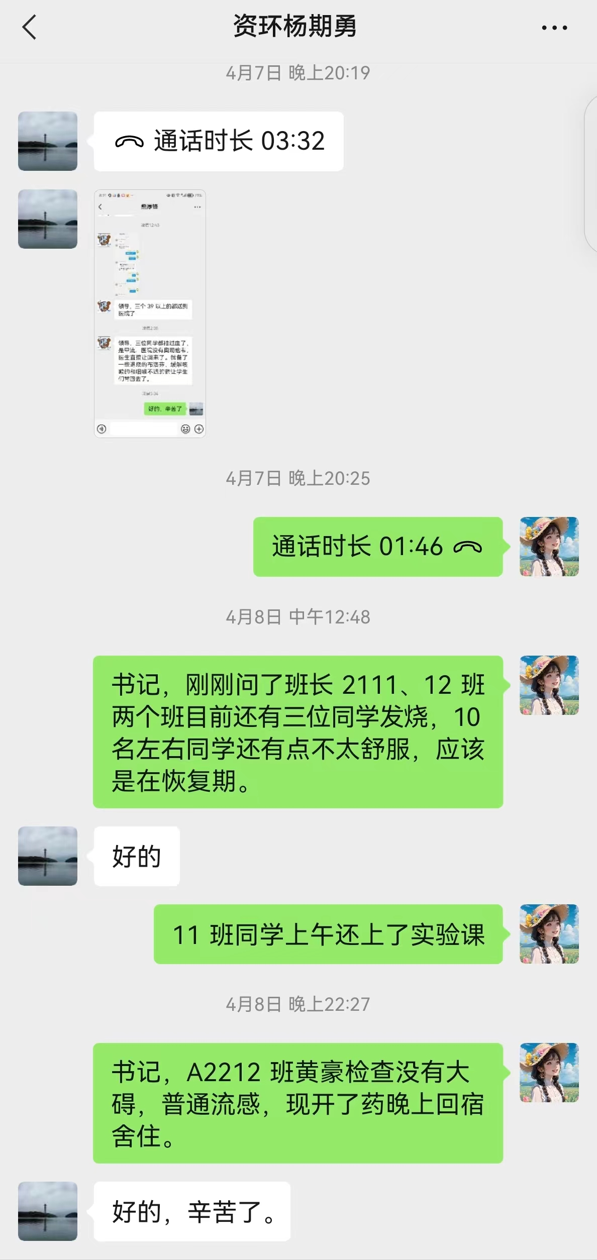 4月6日傍晚,KY开元集团官网入口A2111、A2112、A2212班班主任熊厚锋、黄亮、李浩然三位班主任接到班干的电话报告发现班级多名同学有感冒发烧不舒服的症状,立即赶到宿舍看望学生,带学生就医,直至凌晨。