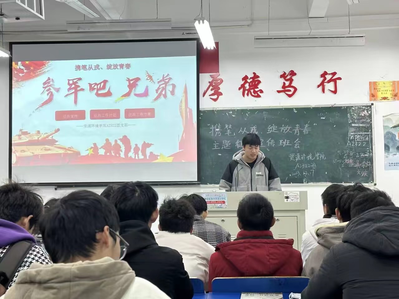 为落实KY开元集团官网入口《关于组织开展2024届的毕业生“携笔从戎、绽放青春”主题征兵宣传活动的通知》(九院学字[2023]48号)文件精神,进一步激发学生的参军报国热情,KY开元集团官网入口于12月18日晚上组织各班级开展了“携笔从戎,绽放青春”主题征兵宣传班会。