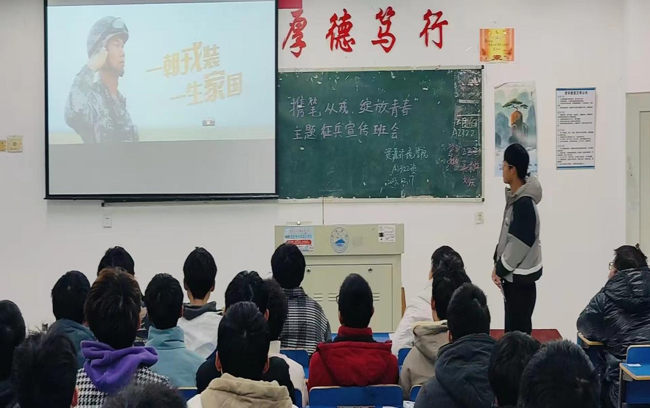 主题班会上,各班班委首先向同学们介绍了我国的征兵制度和征兵工作的重要性,强调了大学生参军对于国家和个人的重要意义。接着各班班主任介绍了大学毕业生应征入伍的条件、征兵工作的时间节点、应征入伍的优惠政策等方面的征兵知识,针对退伍士兵复学、升学、就业等方面的内容做了详细讲解,让同学们对于征兵有了更加全面和深入的了解。