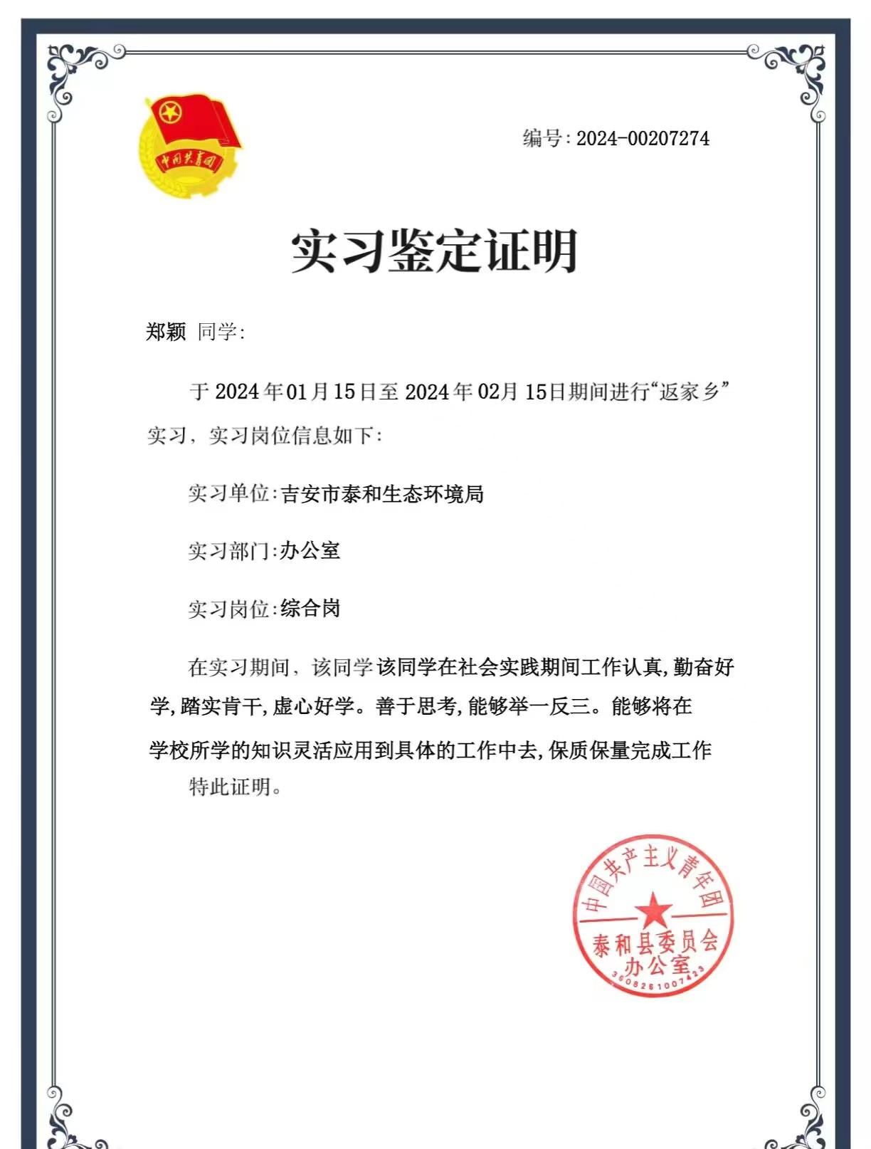 为更好地助力青少年健康快乐成长,寒假期间,团红谷滩区委、九龙湖街道团工委、安丰花园社区团支部组织“青英归巢“返乡大学生志愿者开展”缤纷冬日,快乐成长”寒假小课堂活动。KY官网志愿者惠琬欣积极响应号召。郑颖同学于吉安市泰和生态环境局实习。在实践中,通过切身体会,加深了对环境监测保护的工作和职责的认知,并对其在国家机关中的重要作用有了深刻理解。通过实习,郑颖同学增长了自己的见识,提升了自己的才能,培养了自己的韧性,受益匪浅。