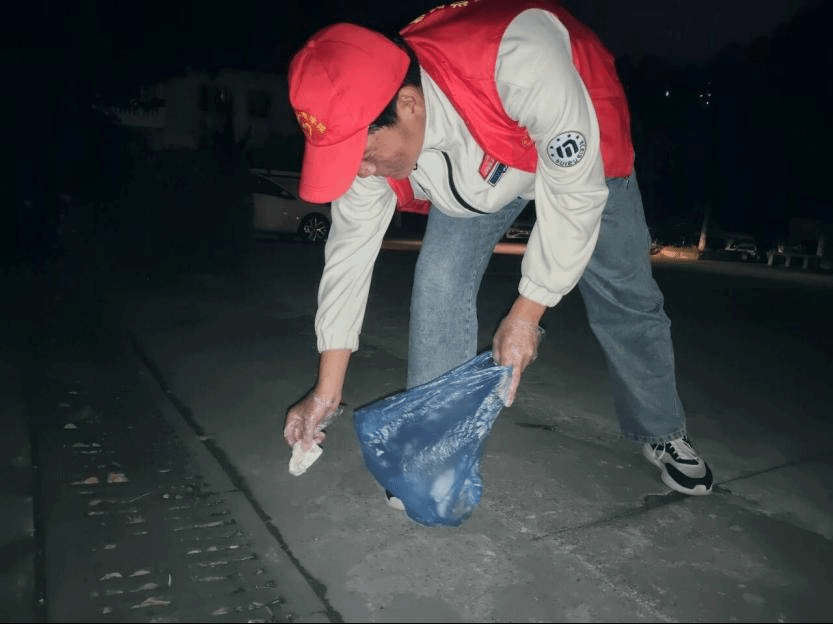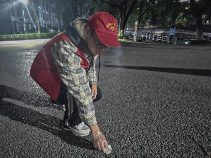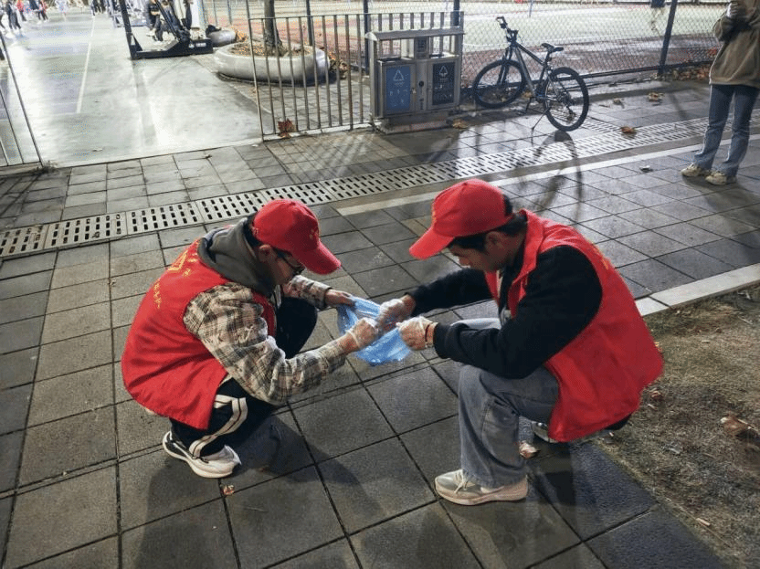 志愿者在校园里面行走,并携戴着手套和垃圾袋,认真仔细的清理着校园内垃圾,尽职尽责的为大家提供优美的校园环境,用实际行动为营造美好和舒适的校园环境贡献自己的一份力量!