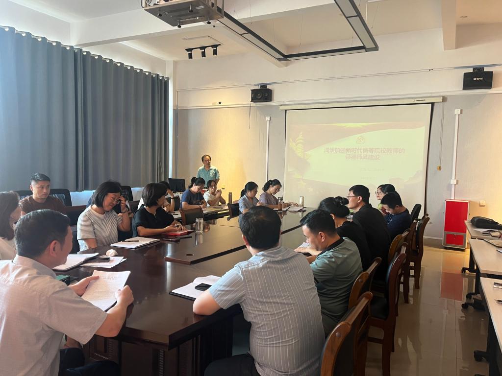 徐常龙作总结,学院一直高度重视师德建设,严格落实师德考核和师德建设“一票否决”制,不断完善和健全师德建设长效机制,开展形式多样的师德建设活动,提升建设成效,希望老师们充分认识自己所承担的神圣的使命,自觉提高师德修养,积极主动将师德规范融入日常教学、教学研究和教学实践中去,以德立身、以德立学、以德施教,为教育事业做出新的更大贡献。
